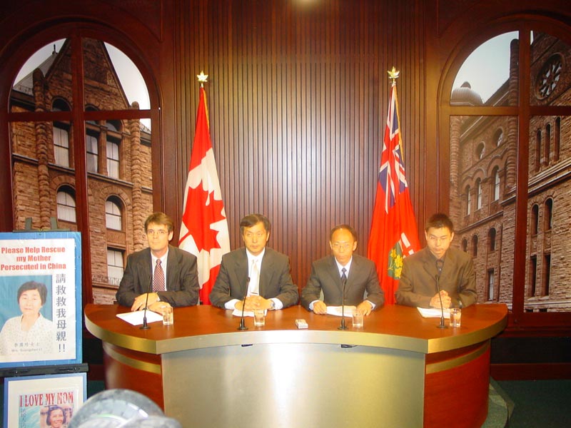 代表加拿大法轮大法协会的张照進首先宣读加拿大法轮大法学会的声明,声明对安省政府和联邦政府三年来对营救何立志所给与的帮助表示感谢。他说:“三年前,在同一地点,我们召开新闻发布会并发起营救安省居民张丽的丈夫何立志”。“何立志是北京一位出色的高级土木工程师,因修炼法轮功被关了3年半”。“我们向所有支持我们的安省人民、省议员、大赦国际和其他非政府组织表示感谢,正是因为他们的支持才使何立志来到加拿大”。