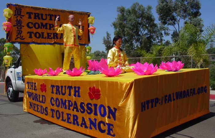 走在法轮功队伍最前方的三名学员举着由中英文书写的“法轮大法”大型横幅,然后是精心装点的花车。花车两侧写着“法轮大法好”和“世界需要真善忍”,花车后面是大法网站的网址,车身前方两侧贴有免费教授法轮功的海报。花车上的学员在游行过程中不间断地演炼着五套优美舒展的法轮功功法。紧随花车之后的是由六名穿着中国传统服饰的女学员组成的舞蹈队,他们在大法音乐的伴奏下翩翩起舞,高贵优雅。最后是由10多名学员组成的腰鼓队。法轮功队伍在整个游行中既壮观又祥和,学员们用不同的方式向世人展示大法的美好。