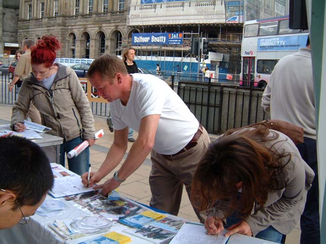 学员们在爱丁堡市中心设置了法轮大法信息展位,告知人们正发生在中国的群体灭绝罪行的真实情况。数百位民众在主张江××要为迫害夺走960条人命负责的请愿书上签名。(据中国官方文件的数据——实际被迫害致死的人数达数千人。)