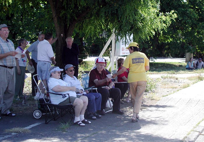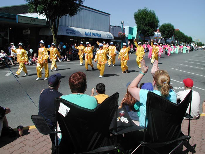 【明慧网2004年6月21日】二零零四年六月十九日,加拿大温哥华法轮功学员参加了兰里市的游行。兰里市距离温哥华市有一小时的车程。学员们觉得城市游行是一个很好的洪法讲真象机会,于是大家决定积极参与。游行中,学员们优雅的舞蹈和功法演示得到阵阵掌声。一位西人老太太说:“多么美啊,我了解一些法轮功的真象,中共(江氏集团)的害怕是多么荒谬啊。”