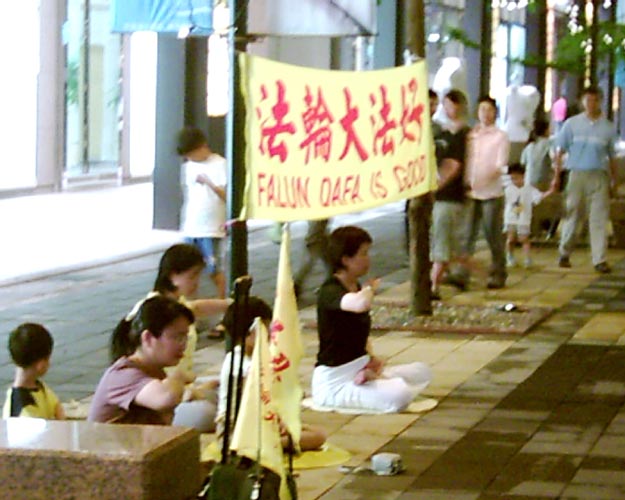 淡水捷运站是假日人潮汇集的地方,这天我们把一幅非常大的横幅挂起来,黄底红字写有中英文“法轮大法”的横幅,在风中飘扬非常耀眼。三个外国人一面念着“Falun Dafa”,一面走近,很专注的看着我们炼功,其中一个人很急切的用英文说他到台湾四个月了,听说台湾有很多人炼法轮功,却一直找不到炼功点,今天真是太幸运了,终于找到法轮功了。