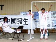 两位法轮功学员展示中国大陆用以迫害法轮功的百种酷刑中的“吊铐”和“坐老虎凳”;而另一侧则是法轮功学员展示法轮功的功法;强烈的反差,立刻引起了路人的注意,不断有人前来询问。