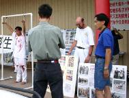 两位中年妇女问:“我们只知道中国镇压法轮功,但不知道是什么原因?”一位法轮功学员首先向他们介绍什么是法轮功:“法轮功修炼‘真、善、忍’,修心向善,做一个好人,更好的人。法轮功是性命双修功法,既修心性,又炼五套功法。”其中一位妇女听了说“这是一种气功嘛。”法轮功学员又告诉她们:“由于修炼法轮功受益无穷,炼法轮功的人数越来越多,引起了江泽民的妒忌,开始下令镇压法轮功,以各种酷刑残酷迫害法轮功学员。今天展示的‘酷刑’,只是江氏集团施展的无数酷刑中的两种。”这两位妇女一直认真的听着,最后问:“哪个地方可以教功?”法轮功学员给予了回答。