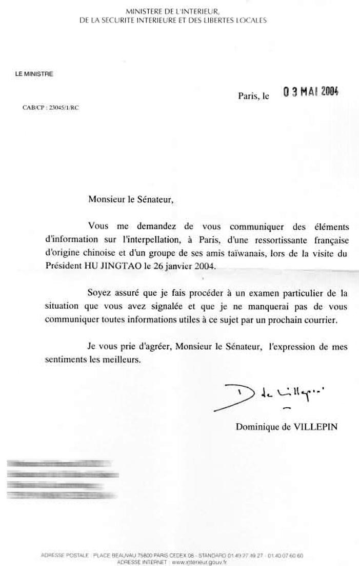 3月31日,法国参议员贝尔纳-若力(Bernard Joly)致函新任内政部长多米尼克-德-维尔潘先生(Dominique De Villepin),对法国警察骚扰法轮功学员的行为表示关注(见https://www.minghui.org/mh/articles/2004/5/29/75926.html)。