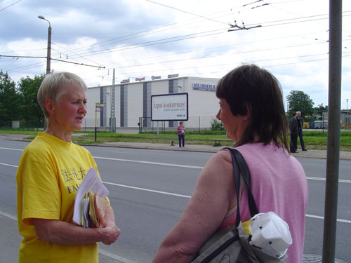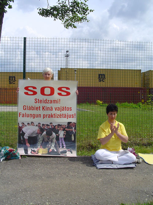法轮功学员们在中使馆前展开了用英文和拉脱维亚文写的“呼吁停止在中国对法轮大法的迫害”的横幅。过往的行人都拿到了关于在中国法轮功学员因为坚持信仰而遭受江氏集团各种酷刑迫害的真象资料。很多行人都表示了他们对法轮功学员在中国所遭受的迫害的同情并表示支持学员们的反迫害努力。