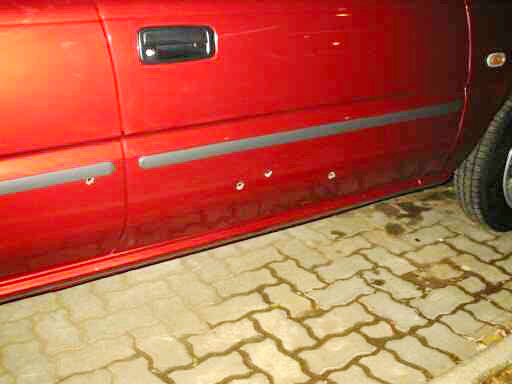 ![]() 南非时间6月28日晚8点半左右,一辆白色轿车从侧后方,向法轮功学员的车内开枪射击。图为车上留下的弹孔,车胎被打破。 |
