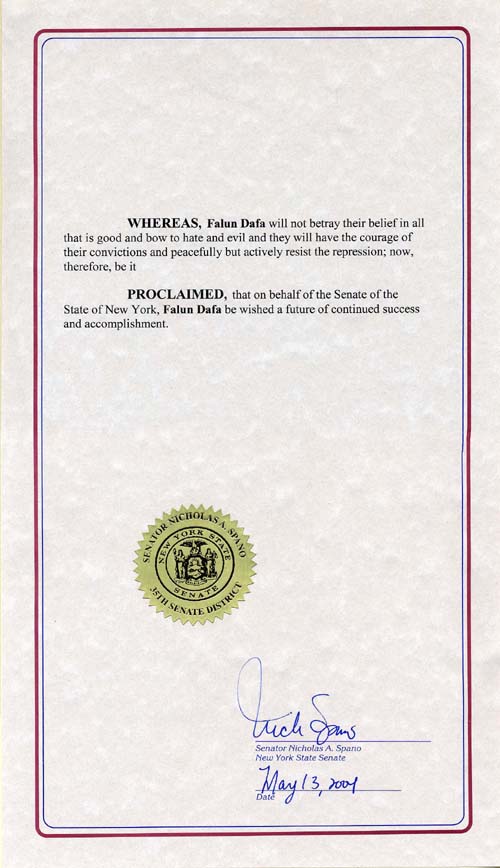 因此,我现在代表纽约州参议院祝愿法轮大法学员不断取得成功,直至达到目地。