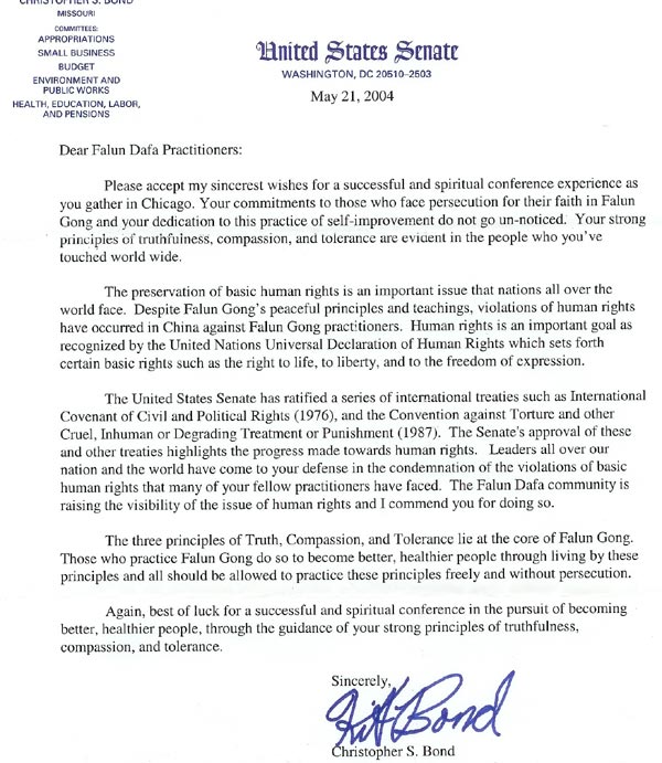 美国参议会已经批准了一系列国际条约,诸如《公民与政治权利国际公约》(1976),《反酷刑公约》以及《禁止酷刑及其它残忍、不人道或有辱人格待遇或处罚公约》(1987)。参议院对这些及其它公约的确认突出显示了人权方面的進步。我们国家和世界其它国家的领导人站在你们一边,对你们许多同修所遭受的人权侵犯予以谴责。法轮大法修炼群体正在使越来越多的人意识到人权问题,我赞赏你们这样做。