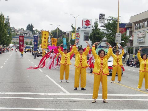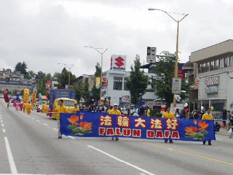 【明慧网2004年6月7日】2004年6月5日,加拿大温哥华法轮功学员应邀参加本那比市每年一次的脱帽节(Heights)游行,沿途获得观看市民的阵阵掌声。许多从中国来的新移民都全家兴致勃勃的观看法轮功学员的功法表演、彩带舞、扇子舞,并愉快的接下了法轮大法真象资料。