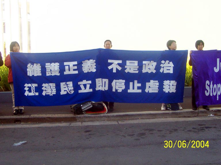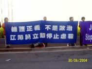 法轮功学员们打着不同颜色的横幅: “澳洲法轮功学员支持公审江泽民”, “大家一起来结束这场虐杀”, “维护正义,不是政治”, “结束江氏全球性恐怖主义”,表达他们心里面的呼声。