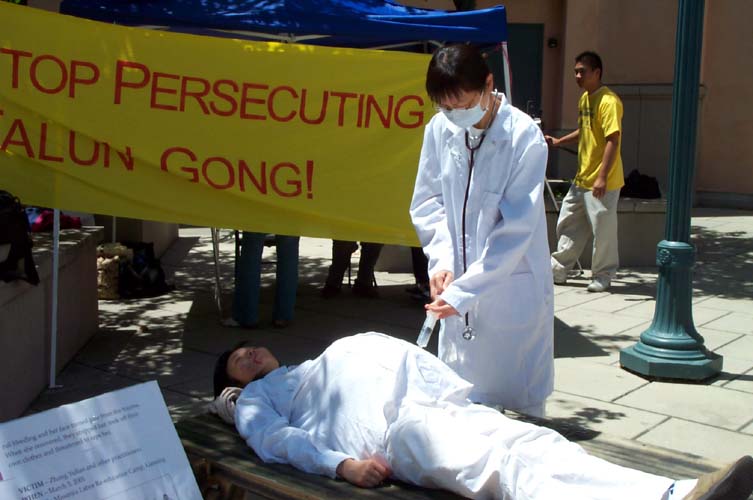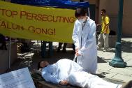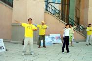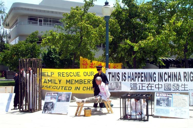 在凝重的音乐声中,学员们演示着被吊打、坐老虎凳、被插竹签、折磨性灌食、被强行堕胎、关铁笼子等,把千千万万中国大陆的法轮功学员受到的残酷迫害的现实,活生生的展示在人们的面前。还有部分学员在酷刑展旁演示功法。很多路人仔细的观看每一个酷刑和图解,有的表示这么好的功法,不应受到残酷的迫害。有的与学员交谈了解更多真象,