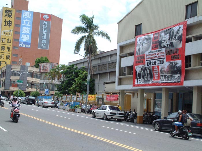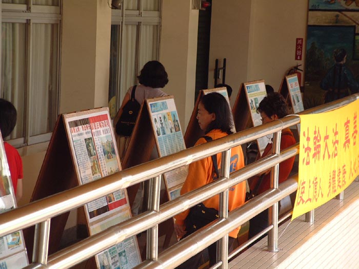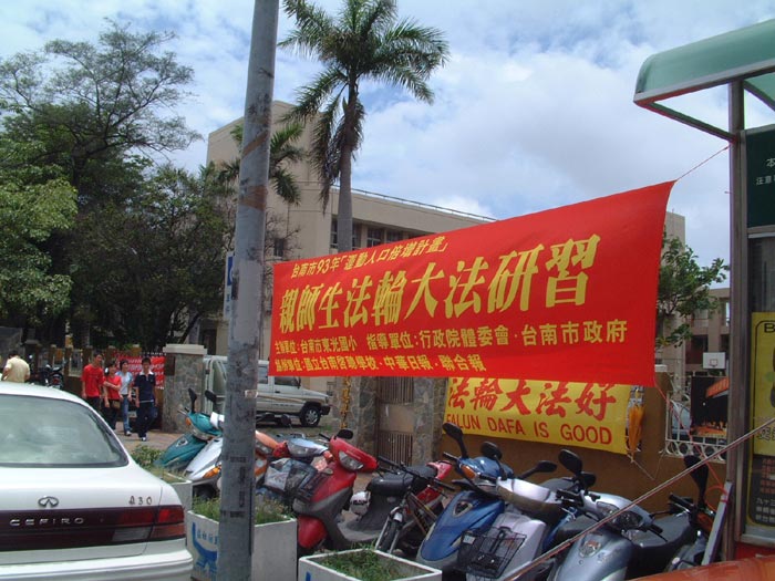 在会场外及台南启聪学校的外墙还挂出了法轮大法洪传世界及大陆江氏集团酷刑虐待法轮大法学员的图片,并以大银幕播放相关影片,请现场观看的民众了解法轮大法“真、善、忍”的法理所带给人们的美好并发出善心同声谴责江氏集团迫害法轮大法的暴行。