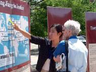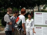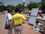 一位白人女士看了酷刑展后,极为震惊和感动,主动提出帮助。她告诉学员她所在的教会隶属于一个全国性的人权组织,她会帮助我们与他们取得联系,并能够与其合作以制止中国对法轮功的迫害。走之前,她还向学员们要了很多真象资料,要到她所属的教会去发给其他人看。