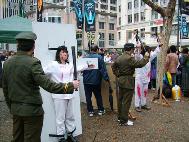 展示的酷刑包括老虎凳、铁烙、吊打、电刑、钉子笼等近十种。每一种酷刑都触目惊心,形象的表现出了中国的法轮功学员为了坚持信仰、向民众讲清法轮功真象所承受的巨大苦难。一些亲身经历迫害的学员也在展示中心向过往的行人讲述邪恶的迫害。过往的行人被深深的震撼了。很多人主动询问并拿了真象资料。