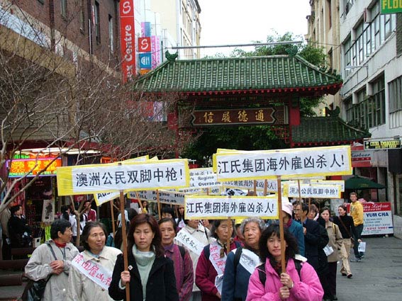 集会于下午1时左右开始,从南非回来的澳籍公民代表、全球反对中共输出国家恐怖主义大联盟、全球审江大联盟、追查迫害法轮功国际组织、社会民主人士等在集会上发表了讲话。法轮功学员的酷刑演示同时進行。2时左右,游行队伍从Sydney Town Hall出发,经市中心主要繁华商业街,到达华埠唐人街,各团体又于唐人街再次发表演讲。