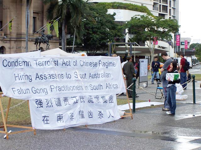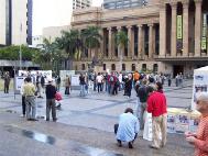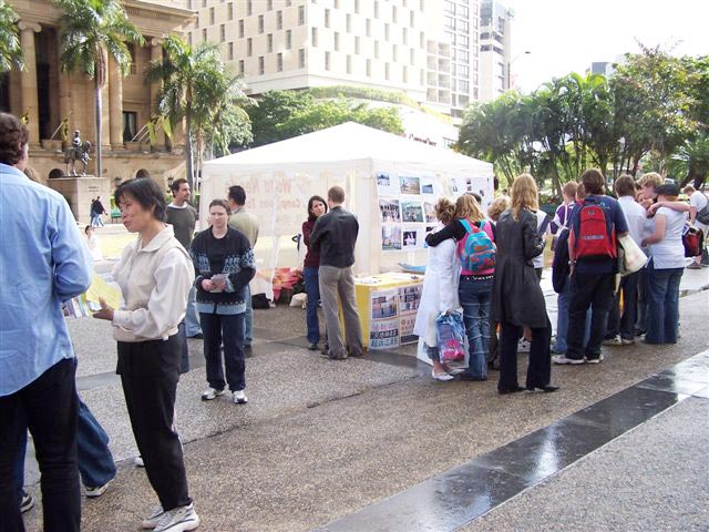 有个年轻人,名叫麦克,他原准备去市中心买音乐光碟,喝点啤酒,轻轻松松的玩一天。可是,看到酷刑展后,他的心情一下子沉重起来,受到了很大的震撼。他仔细的看了介绍,并跟学员长谈。他说:“这个展览冲击着人们的心灵,如果不是这些触目惊心的酷刑展示,我可能就走过去了。你们做得好,就是要强调残酷的现实,让人们了解到这场迫害有多深,有多黑暗!可能我今天一天心情都会很沉重。虽然我并不希望心情沉重,但我宁肯心情沉重,并在你们的征签簿上签名,也不愿意当个无知的糊涂人。”