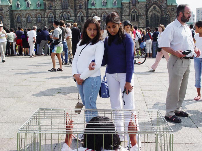 当天的酷刑展在国会山吸引了如潮的观众。善良的加拿大人被眼前的景象震惊了。两位来自加拿大外省的女孩在接受采访时表示,无法相信这样残酷的事情正在中国发生。法轮功学员何立志也是酷刑受害者之一。他在国内因为拒绝所谓的“转化”,曾被监狱警察用上万伏的电棍电击和长时间的体罚。