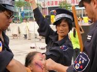 在现场除了以行动剧演出在上个月28日中共国家副主席曾庆红六月底访南非时,9名澳大利亚籍的法轮功学员前往南非总统府宾馆的现场進行和平请愿,却在从机场往现场途中,有人朝学员车辆开枪射击的情况,还演出灌辣椒水、关铁笼、夹指甲等酷刑,场面相当血腥。