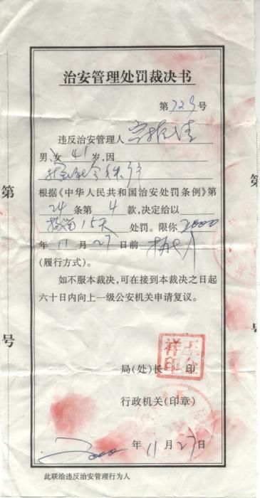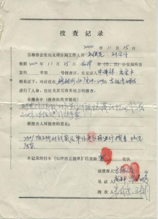 可在2000年11月份被当地派出所把我、黄光郁、尚春光等8、9个人绑架到派出所,还有一些真象资料,并把我被绑架的情况通知厂保卫处。保卫处的窦处长逼我说出法轮功的真象资料从何而来,我不说,他就用脚踢我,打我的头,后被拘留15天,拘留期满后,回家呆了半个月,派出所又以谈话的形势逼我背离法轮功。我不配合他们,派出所就以处理轻了的理由把我送往吉林市第三看守所。在看守所关押1个月后被判劳教1年。在劳教所里为抵制对大法弟子的迫害,劳教所的全体大法弟子全体集体绝食抵制迫害,恶警们拿了很多电棍警棍对所有大法弟子没头没脑电,并且没头没脑的拳打脚踢,很多大法弟子被打的没有好地方,一些在押的犯人都被这残忍的手段吓住吓哭了。劳教回来后,由于自己怕心太重,不能很好的看书学法,派出所还经常来我家骚扰,使自己不能正常的修炼,因此才造成自己病业缠身,不能自拔,今后要加倍弥补做个真正的大法弟子。