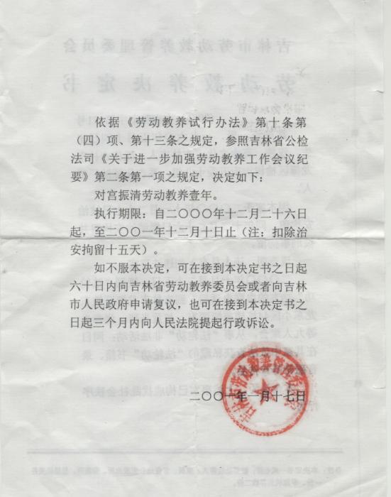 拘留期满后,回家呆了半个月,派出所又以谈话的方式逼宫振清背离法轮功。他不配合邪恶,派出所就以处理轻了的理由把宫振清送往吉林市第三看守所。宫振清在看守所关押1个月后被非法判劳教1年。在吉林市欢喜岭劳教所里为抵制对大法弟子的迫害,劳教所的全体大法弟子集体绝食抵制迫害,恶警们拿了很多电棍、警棍对所有大法弟子没头没脑的电,并且长时间拳打脚踢,很多大法弟子被打的身上没有好地方,一些在押的刑事犯人都被这残忍的手段吓住吓哭了。他在劳教所受了很多的迫害,后来由于身体的原因,他被保外就医。在身体恢复期间,由于家人的压力,当地派出所恶警经常去扰乱,还时不时威胁、恐吓,使他根本不能安心学法炼功,由于宫振清屡次被恶人骚扰,身体和精神上受到严重伤害,被迫放弃修炼。