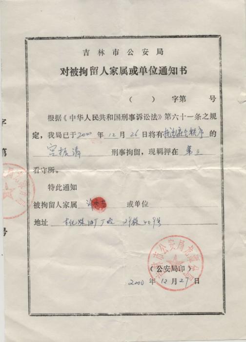 在2000年11月份他和大法弟子黄光郁、尚春光等8、9个人被吉化炼油厂派出所绑架。当时恶警还搜走了一些大法真象资料,并把宫振清被绑架的情况通知厂保卫处。保卫处的窦处长逼宫振清说出法轮功的真象资料从何而来,他不说,窦处长就用脚踢他,打他的头,宫振清后被拘留15天。
