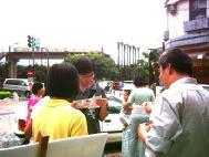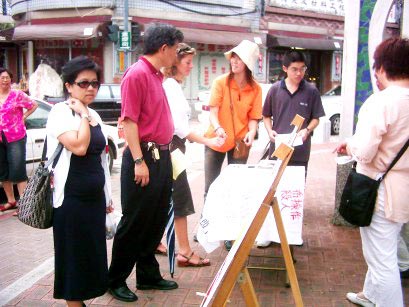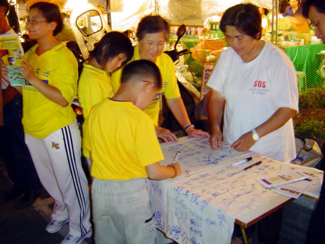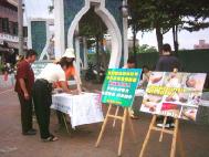 有一位先生说他是跑船的,常去大陆,他很清楚情况,那里高压统治,人民没有自由,法轮功炼功锻炼身体很好,但在大陆当初太受欢迎了,太多人炼了,江氏集团就见不得人好,就要铲除你。他觉得大陆很多人很可怜,头脑被洗得很干净,以前6.4天安门杀那么多学生,他拿台湾报纸去给他们看,那些人不相信还说是台湾造假新闻。学员请这位先生再去大陆时别忘了把法轮功真象告诉人们,他说有讲啊!与学员聊完后就马上签名,他说这是维护基本人权,一定要签。
