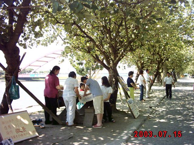 【明慧网2004年7月17日】为了声援二零零四年六月廿八日在南非遭枪击重伤的澳洲法轮功学员,并强烈谴责江氏集团把国家恐怖主义扩张到海外,请善良的人们共同制止江氏集团迫害法轮功的暴行,台湾基隆学员这一周来展开三场征签活动,两天在市区公车循环站下午4:30~7:00的下班时间征签,周六上午基隆郊区学员在著名的景点情人湖洪法炼功和征签,三日下来民众反应热烈,征集大量民众支持。