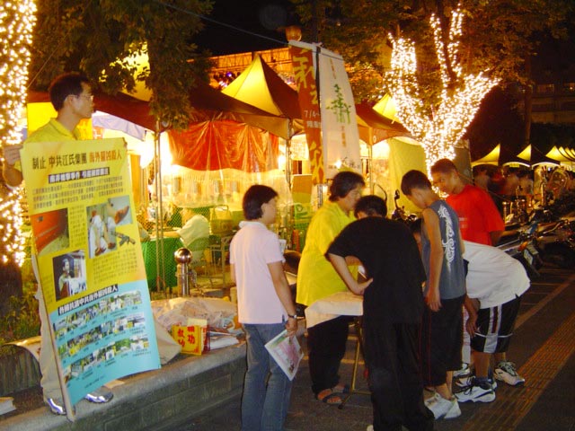 自2004年7月11日起连续一周,学员们白天在冬山河亲水公园(国际童玩节) 、晚上在罗东夜市(艺穗节)人潮聚集的地点,征求民众的签名,表达对上述恐怖主义行径的唾弃。学员手持写着“制止江氏集团海外雇凶杀人”的醒目海报 ,有的分发传单简介,向游客讲述法轮功真象与枪击事件始末,希望能为台湾民众发出谴责暴力的正义之声留下历史的见证。