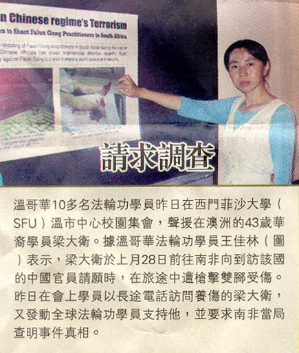 温哥华明报报导法轮功学员要求调查南非事件(图)