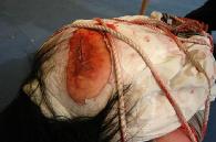 7.迫害性鼻饲灌食酷刑:几个狱警抓住法轮功学员头发往后仰,让学员坐在床板、椅子或地上,恶人们拿一条近小手指粗的塑胶管在食道与胃里捅来捅去,一会儿食道就被捅破了。管子在破了皮的口腔和小喉、食道的血肉上捅来捅去,刺心般的痛苦,使人透不过气来,而且是多次插管,从一个鼻孔插入,抽出,又从另一个鼻孔插入。