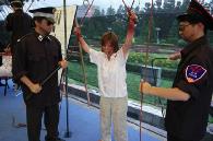 9.压刑:把人的两只胳膊捆到背后,然后压在很低的木板床下,床板上坐上人或站人,使劲往下压。这种压型使人的骨头几乎断裂,这种折磨导致长期不能行走甚至瘫痪。