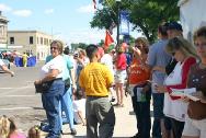【明慧网2004年7月19日】科罗拉多州东部重镇福特摩庚(Fort Morgan)迎来了一年一度的夏季游行。当科罗拉多州的法轮大法学员们汇集在(Fort Morgan) 福特摩庚镇时,晴空万里,镇上的人们特别热情洋溢,在驻足观看的同时,纷纷主动索要法轮大法的真象资料。在游行队伍中,普度音乐,漂亮的花车及功法表演,都赢得了人们的阵阵掌声和欢呼声,并时不时的有人跑上前去照相。也有的人们边看花车功法表演,边模仿着动作。