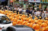 腰鼓队后面是“洪法”队伍和功法演示的车辆,学员们举着大法洪传世界的各式图片和横幅,向市民展示着法轮大法历经五年的狂风暴雨,依然迅速的洪传世界并享有崇高的国际声誉。难怪有两位中国观众惊叹道:“了不得了,法轮功发展的这么快呀!江××怎么可能镇压的了呢!”