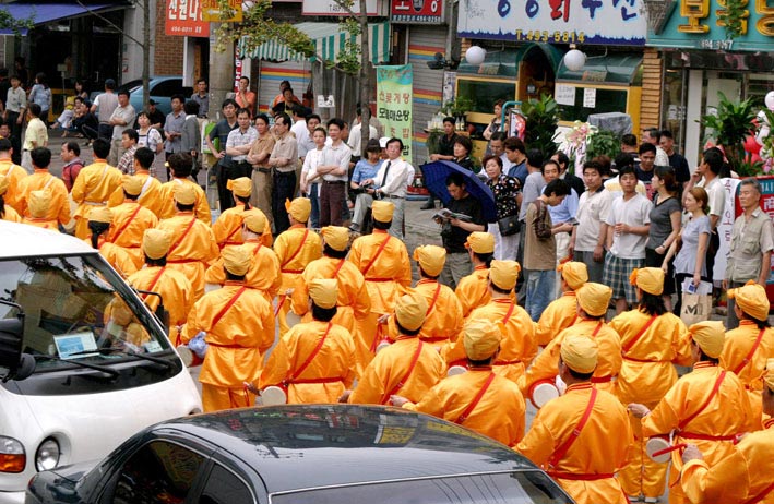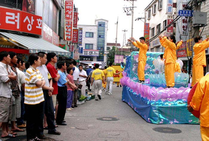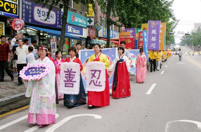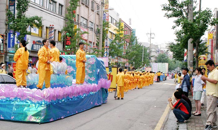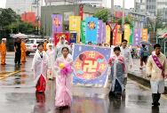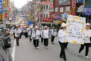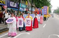 下午一点发正念后,浩浩荡荡的游行队伍出发了。在花车指引下,八位身着韩服的法轮功学员抬着两幅巨大的法轮图形走在队伍前面,彩旗队打着印有“真、善、忍”和“法轮大法”字样的五彩缤纷的彩旗紧随其后。