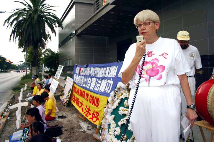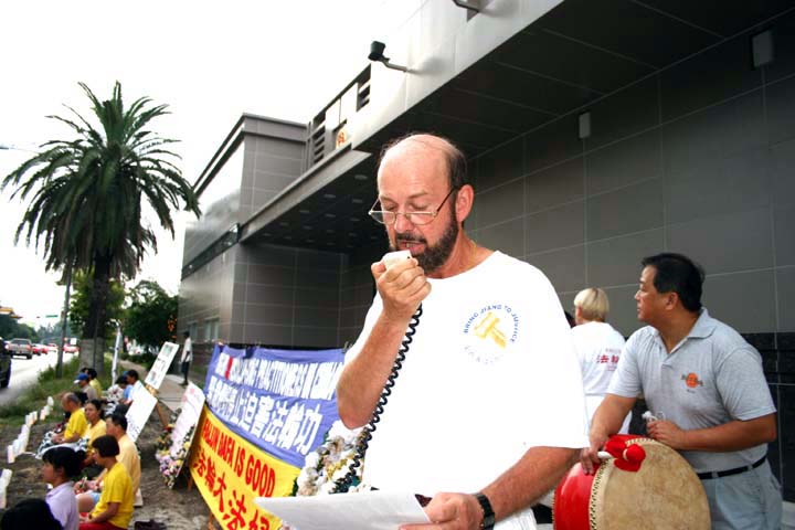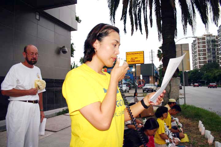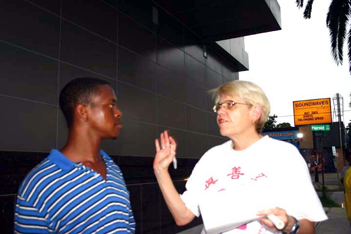 2004年7月19日夜晚七点至十点(即中国大陆时间7月20日),休士顿法轮功学员在中领馆前举行烛光守夜;悼念为坚持信仰、维护“真、善、忍”而献出了生命的同修。路边摆放着写有“悼念”的花圈,木架上悬挂着用英文写的大型横幅“呼吁终止江氏集团对法轮功的迫害”,路边摆放着一盏盏的蜡烛,烛光闪闪,照亮了黑夜,引起了路人的关注,向学员打听发生了什么事情?学员立刻将真象告诉路人,有些驾驶员鸣汽车喇叭和声示意支持。