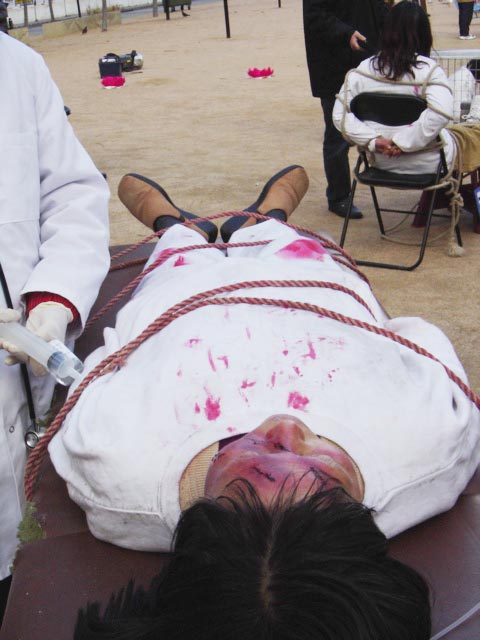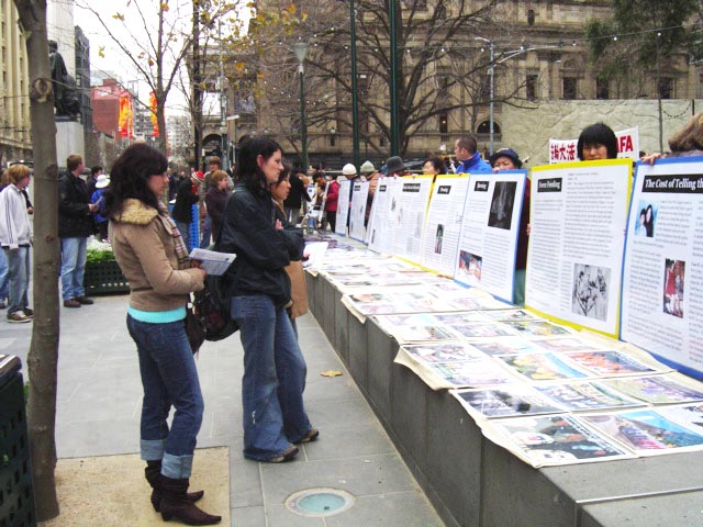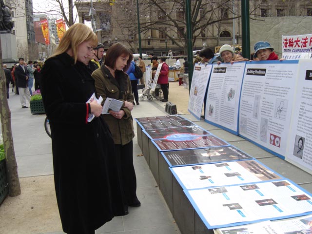 5位曾在中国大陆遭受酷刑迫害的法轮功学员在酷刑展场上向行人展示了他们曾被施予的酷刑:坐老虎凳、囚笼、钉竹签、电吊拷打和毒液注射。一位展示酷刑受难的女学员在酷刑展后向关切已久的人们介绍:“这些展示的酷刑还只是3年前我在中国劳教期间自己和其他被囚学员所遭受的,可现在的情景更坏,恶警使出的招更恶毒,在中国已有1000余法轮功修炼者被证实死于残酷迫害。”一对澳洲土著夫妇边看酷刑展边落泪,并不停的说,“太无人道了,太不可思议了,我们能为你们做些什么?”这对夫妇被学员带到了征集签名处。