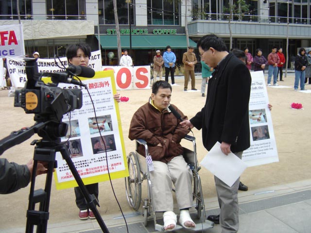 在南非遭中共黑枪射击的David Liang不远千里在另一名学员的照顾下坐轮椅从悉尼赶来参加现场演说活动。David向人们讲诉了亲身经历的黑枪事件,并分析了江氏集团雇凶杀人的卑鄙阴谋和诡计。他的演讲引来观众的阵阵掌声。演讲后,很多人还围在他的身旁,向他表述关切、问候及深深敬意。两位来自墨市大学的学生也把这一感人的场面用他们的照相机记录下来。他们说:“江一伙犯下的不只是种族灭绝,更严重的是它们已把这种恐怖伸向全世界,很明显,澳洲是这次恐怖的直接受害国。”他们还向学员表示要把照片给更多的同学们看,让他们都来了解这一震惊国际的事件。