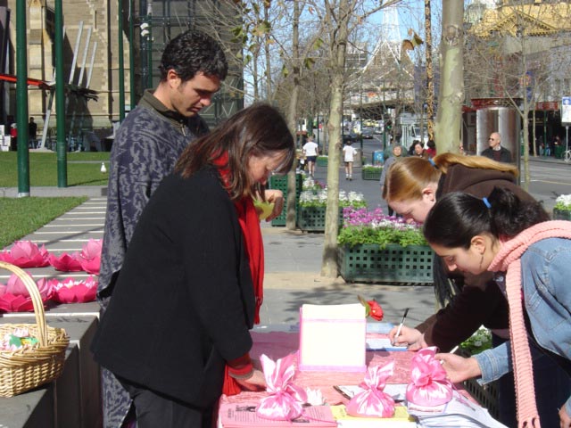 在广场的另一侧的展桌前不时的簇拥着叠纸莲花的行人。叠纸莲反映了他们对大法的美好祝愿。一位老者说,“我要多折些送给孙子孙女们,教他们说‘Wonderful Falun Dafa’(法轮大法好)。”路过这里的孩子们则成了纸莲花的爱好者,他们不但叠纸莲,还把叠好的莲花送给路边的行人,最后,他们还要在征集签名簿上留下他们的名字。一名学员向两个询问的十一二岁的男孩解释道,“签名是呼吁澳洲政府关切发生在澳洲公民身上的被黑枪致伤的这一对法轮功学员进行迫害的恐怖暴行,让澳洲人了解这场发生在中国并殃及海外的迫害真象。”两个孩子听罢转身就走了,没多久,他们领来了10多个和他们同龄的伙伴,每个孩子都认真的在签名栏下郑重的写下自己的名字。