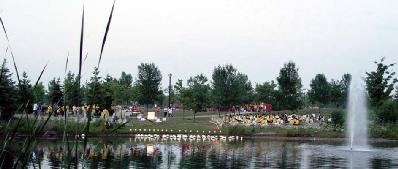 7月19日晚,多伦多学员在市郊士嘉堡的美丽径公园(Milliken Park)举行水灯悼念(把燃点了蜡烛的莲花和灯浮在水上)会,用东方传统的水灯,悼念在中国被迫害致死的千名法轮功学员。几十名来自多伦多各个区的法轮功学员来到郊区幽静,风景优美的美丽径公园举行水灯会悼念。法轮功学员的代表和法轮功之友代表在新闻发布会上发言。