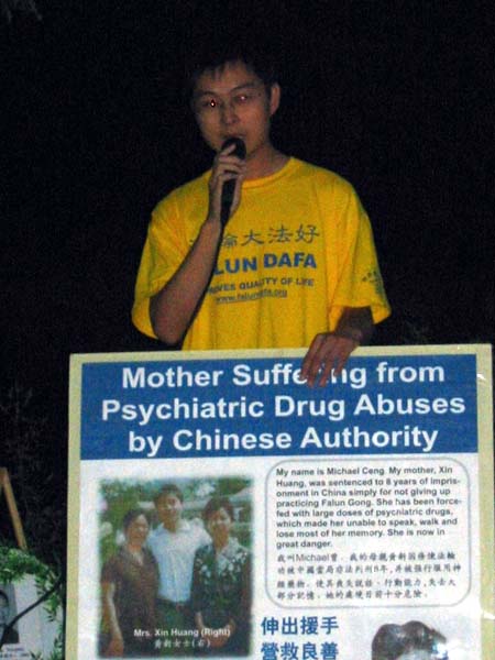 小曾手持一块展板,上面除了他也母亲和合影之外,还有一位小曾叫了20多年叔叔的法轮功学员—王金钟。小曾今年震惊的在明慧网上看到了王叔叔被迫害致死的消息。小曾了解到王叔叔在2004年5月20日下午被辽宁省沈阳市铁西兴顺派出所恶警跨区从工作单位劫持走之后,三个星期后,6月14日就被酷刑折磨致死。听到王叔叔的死讯和母亲在被关押中受到的非人待遇,小曾心都要碎了,他希望更多的人能帮助制止这样的迫害,把他的母亲和其他被关押的学员早日释放。