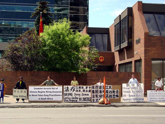 今天中午,当卡尔加里法轮功学员来到中领馆时,已经有两辆警车和两名警察在维护秩序,暗中保护和平请愿的法轮功学员。在最后离去时,警察还不断地向法轮功学员挥手致意;当市民们开车路过时,以鸣喇叭表示对法轮功学员的声援;当民众接过真象传单时,他们说:“我们明白他们(江氏集团)在撒谎…最后祝你们好运。”
