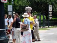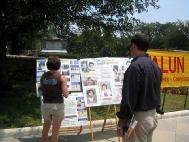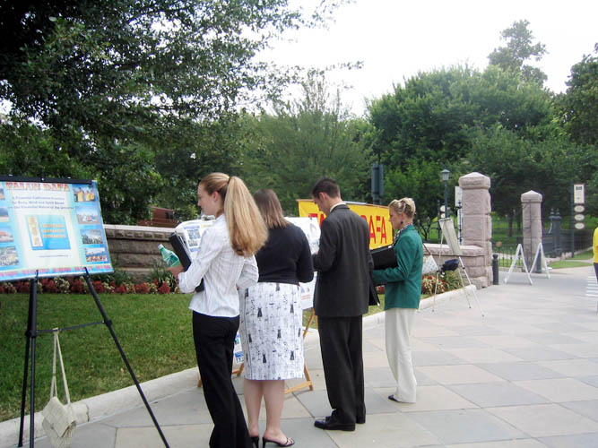 时值午餐时刻,熙熙攘攘的来往行人,包括聚集在这里的游客和众多政府机构的工作人员,都被这一个特殊的场面所吸引,被眼前的迫害真象所震惊。有人拍下这有意义的场面,有人仔细阅读关于法轮功学员在中国劳教所和监狱遭受的惨绝人圜的迫害。