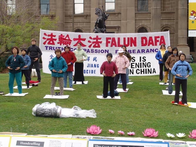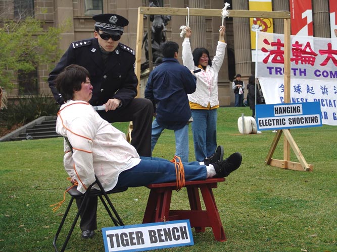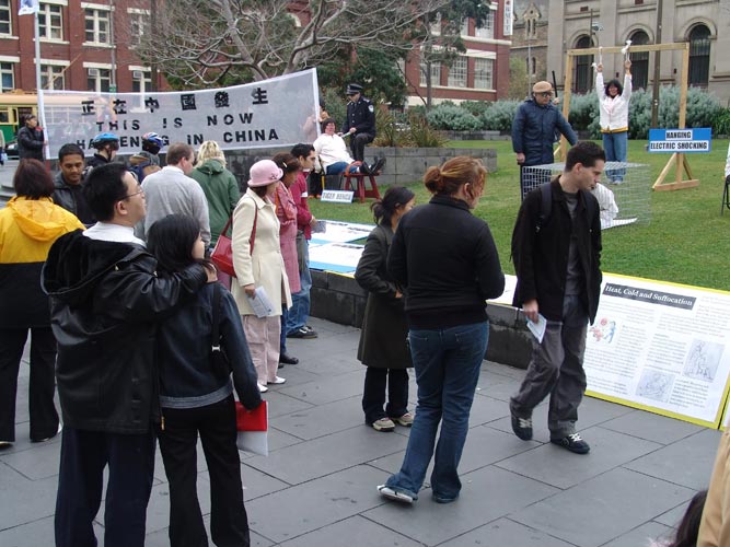 与世界各地法轮功学员举行的反酷刑展遥相呼应,本次活动也用真人演示中国监狱中法轮功学员遭受的部分酷刑。并有详细展板报导各种酷刑种类,如:钉竹签、老虎凳、死人床、灌食、铐刑、关铁笼子、压刑、电刑、火刑、吊打、拖刑等,法轮功学员遭受的苦难牵动了善良的澳洲民众的心,当他们得知这些令人触目惊心的残酷折磨不但是真实的,而且此时此刻正在中国的劳教所里发生时,都坚决表示一定要做些什么来帮助受难的法轮功学员。法轮功学员展现出的和平与坚忍深深的打动了在场的人,越来越多的人都开始主动了解法轮功,有的甚至想要学炼,真象及炼功资料很快告罄。