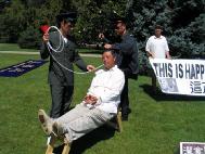 6月29、30日连续两天,北加州的法轮功学员还在州政府大楼前举行图片展和真人酷刑演示,并向过往的政府官员、游客、和行人揭露江氏流氓集团残酷迫害法轮功的真象。发生在南非的雇凶杀人恐怖事件使人们更能看清江氏集团的流氓恐怖主义面目。