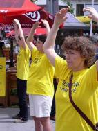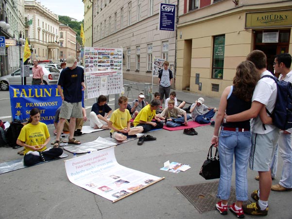 【明慧网2004年7月4日】在世界反酷刑日之际(2004年6月26日),来自捷克共和国,斯洛伐克和英国的法轮功学员于2004年6月23日(星期三)聚集在摩拉维亚首府布尔诺市(Brno),向公众介绍法轮功以及在中国发生的迫害。人们被祥和的功法吸引并当场学功,同时对中国的迫害感到震惊。他们表示支持法轮功并愿意帮助把凶手送上审判台。当地媒体采访了学员并刊登文章和照片進行报导。