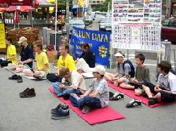 一些人停下来饶有兴趣的阅读展板上有关法轮功的特点和卍字符涵义的介绍,他们还看了一些在中国受到残酷迫害的法轮功学员的图片。许多人观看了伴有祥和音乐的平和的动功和静功功法。