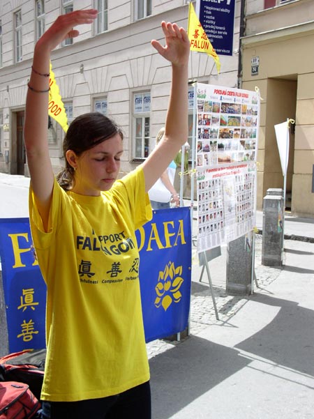 一些学员在布尔诺市主要的公园-鲁赞克伊(Luzanky)公园每周四次教功,他们遇到许多来学功的人们,人数不同寻常。他们向人们介绍了何处可以找到炼功点。很令人鼓舞的是我们看到五个学生也加入了学功的行列,并和学员们一起在大街上打坐。
