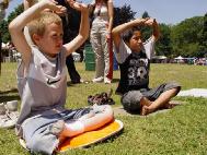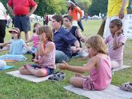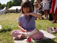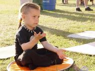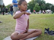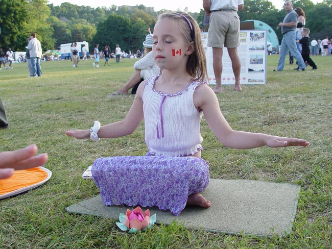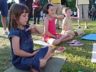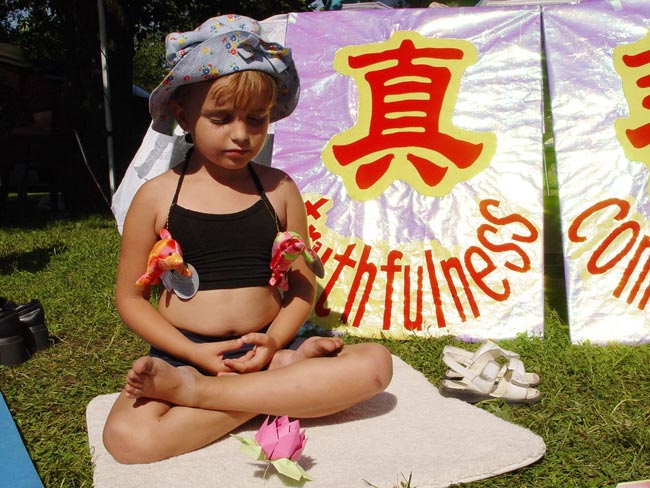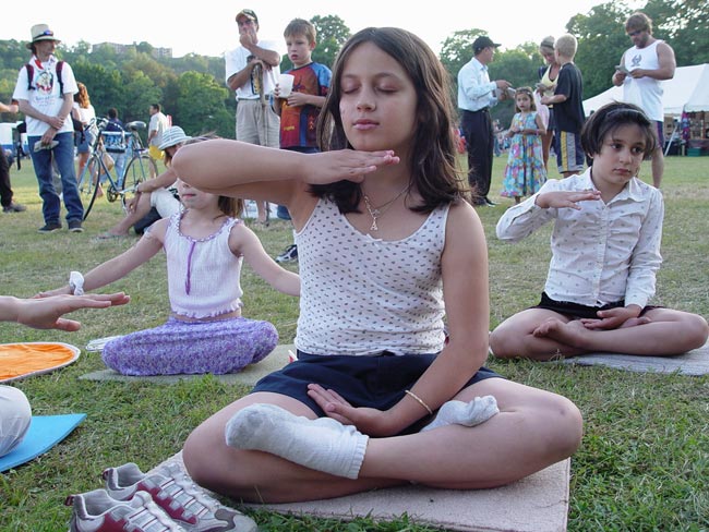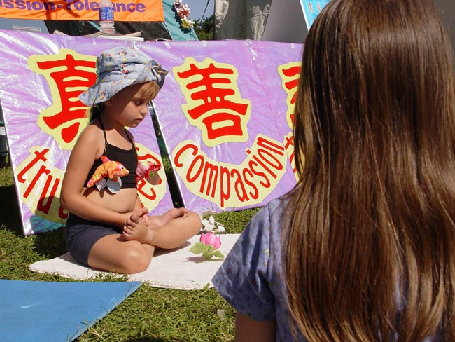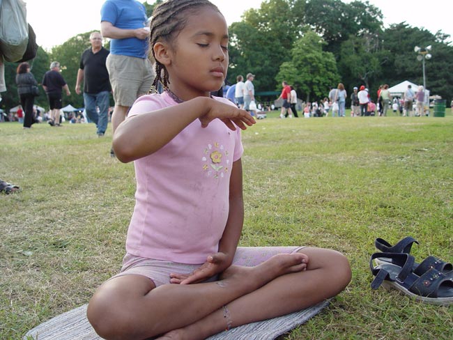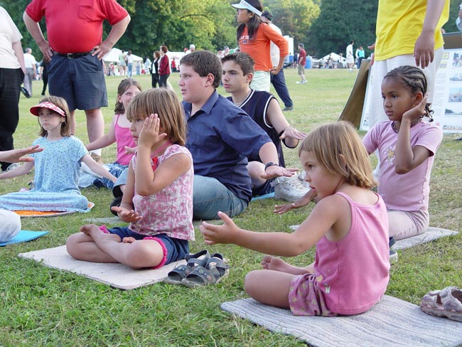 有一个小女孩,前一天已经学过了,当天晚上就自己在家里炼打坐,第二天又到学员的摊位来学,久久不愿离去。令人惊奇的是好多孩子一开始就能双盘打坐,动作非常准确,神情沉静如秋水,一招一式让人以为已经修炼了好长时间了。