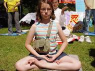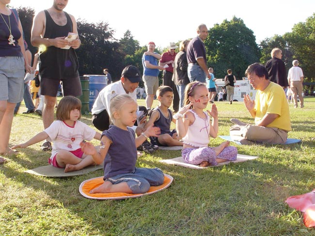 【明慧网2004年7月5日】加拿大的七月骄阳似火,汉密尔顿一年一度的为期四天的国庆庆祝活动更是热闹得很,吸引了来自周边城市的数千人参加,各种摊位鳞次栉比,走走逛逛的人川流不息,其中可能最富特色的可能要数法轮功的摊位了,从早到晚来学功的人一个接一个,尤其是稚嫩可爱的小朋友们,特别喜欢学,别看在父母面前撒娇发脾气的,随着法轮功祥和的音乐中,舒缓优美的动作,孩子们变得出奇的乖,不信,请看下面的一组图片。