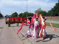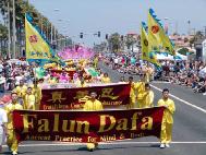 法轮功学员的游行队伍包括标语队、舞蹈队、腰鼓队、花车等部分,是规模较大的游行队伍之一,也是参加游行的唯一一支华人队伍。身着唐装翩翩起舞的仙女、腰鼓队亮丽的黄色服装和整齐划一的动作、花车上盛开的莲花,以及学员们打出的红底金字中英文大横幅“法轮大法”、“真善忍”,在丽日蓝天之下份外醒目。